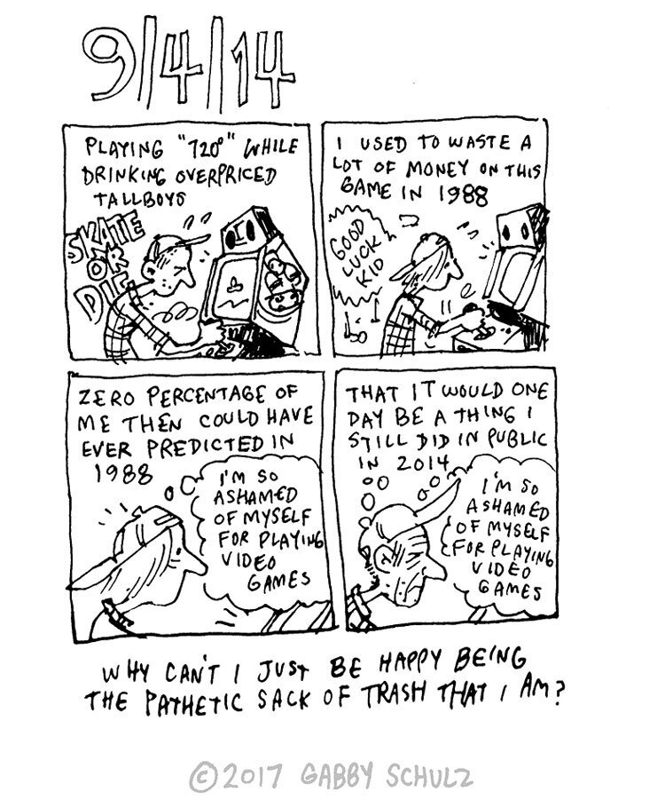 “If these pages have any value it is the voyeuristic thrill of watching a stranger document the implosions of his life in real time, charting all the discrete failures and unutterable, graceless fears that filled the worst years of his life (to date). These pages were drawn during a prolonged period of solitude, nightly drinking and suicidal ideation, as I lost a home, suffered from mysterious debilitating pains, and returned to minimum-wage retail life in a new city mostly famous for segregation, gun violence, police torture, and putting meat juice on sausage.”